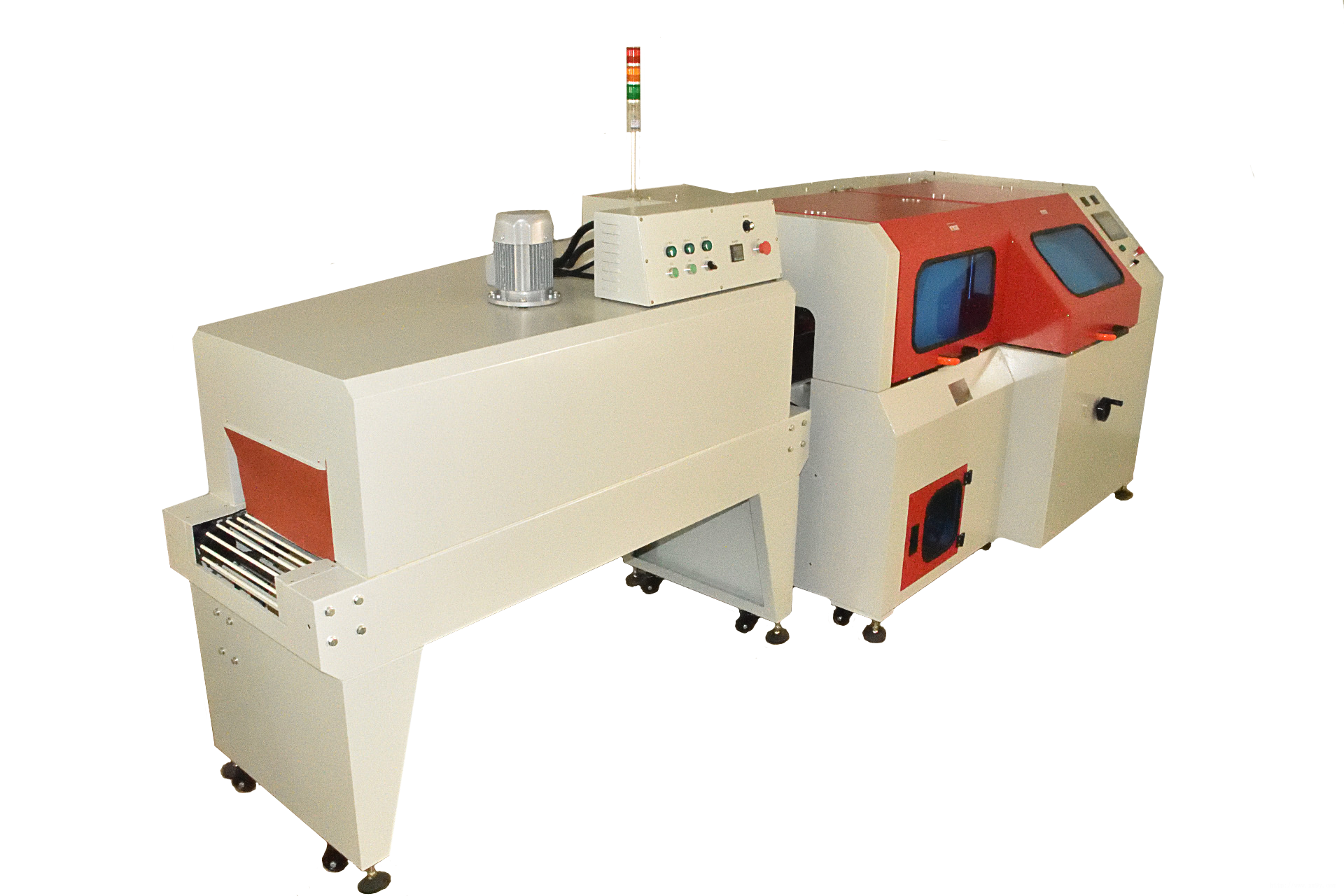 5轴全自动热收缩膜包装机由JYZN-2015GSBJ高速边封机和JYR45-2015热循环热收缩包装机组成